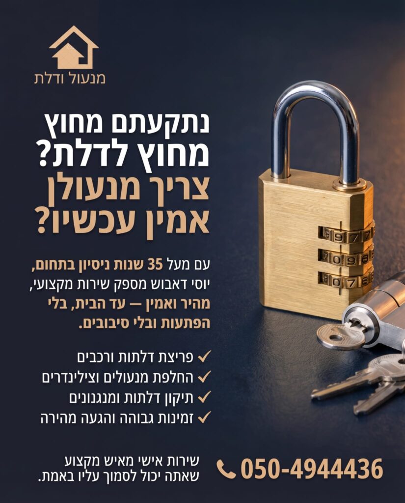 אני מספק שירות פריצה מהיר, נקי וללא נזק מיותר, עם הגעה מהירה לכל לקוח. מעל 35 שנות ניסיון מבטיחים פתרון מקצועי בכל מצב.