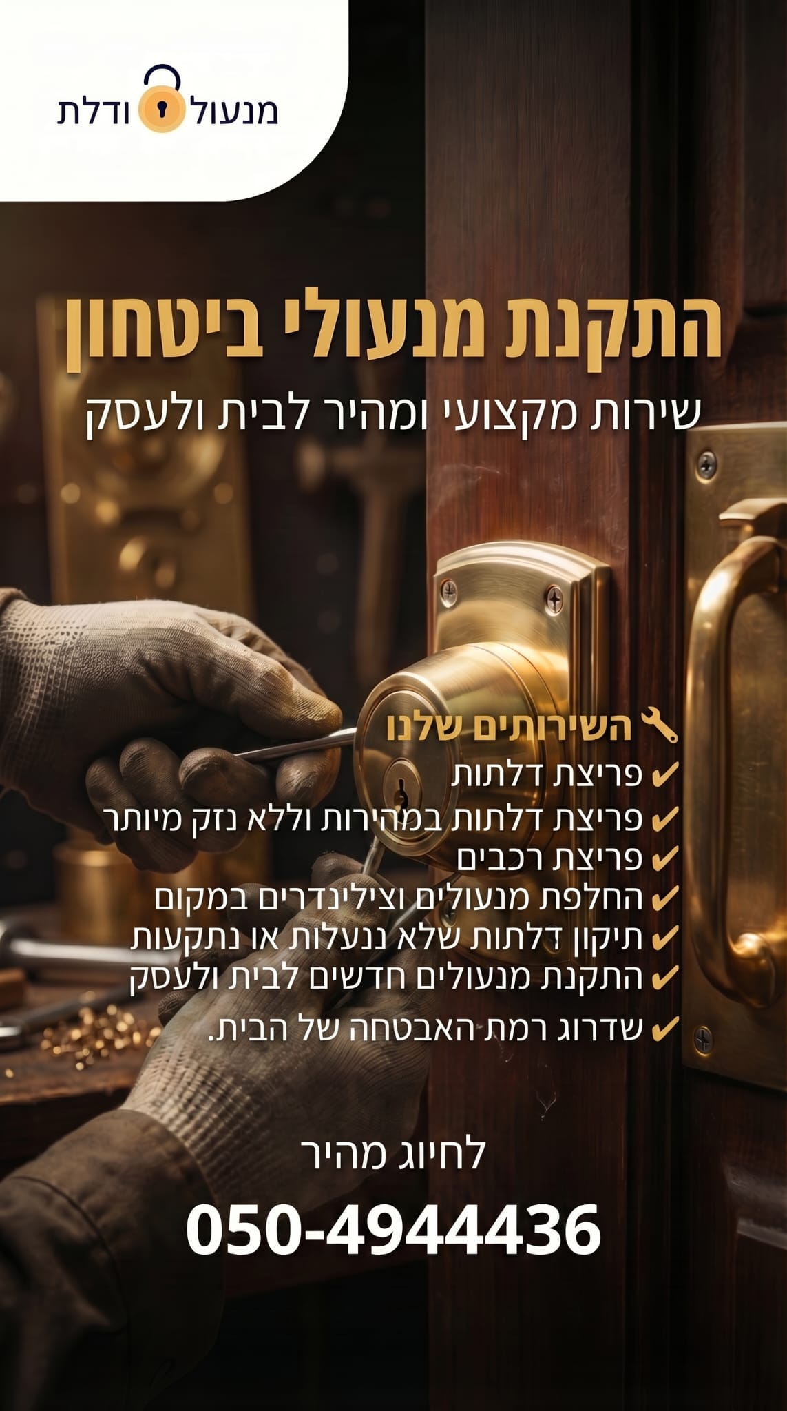 מתמחה במגוון רחב של שירותים: התקנת ידיות בהלה, מחזירי שמן (כולל רצפתיים) ועבודות דלתות ומנעולנות מכל הסוגים.